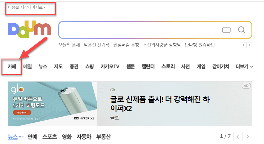 - 다음에 접속한 후, 왼쪽 상단에 있는 '다음을 시작페이지로'를 클릭합니다.